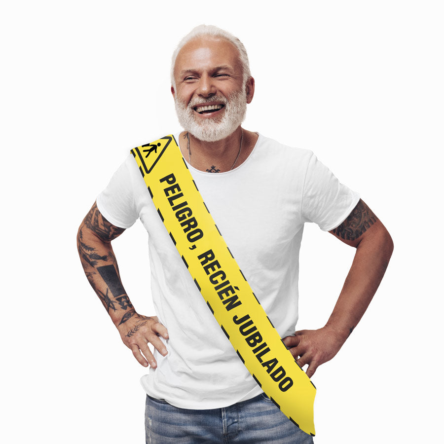 Banda para comemorar sua aposentadoria da forma mais divertida. O mo material da banda é papel laminado inquebrável e à prova d'água. Prova das aposentadorias mais loucas! ¡A aposentadoria começará pela porta da frente!