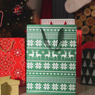 Sacola pequena para presente medindo 18 x 10 x 24 cm com tema natalino.