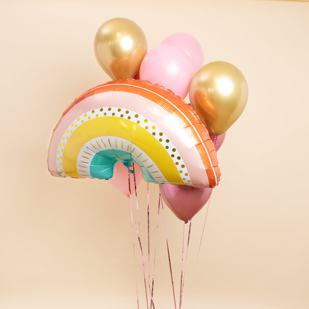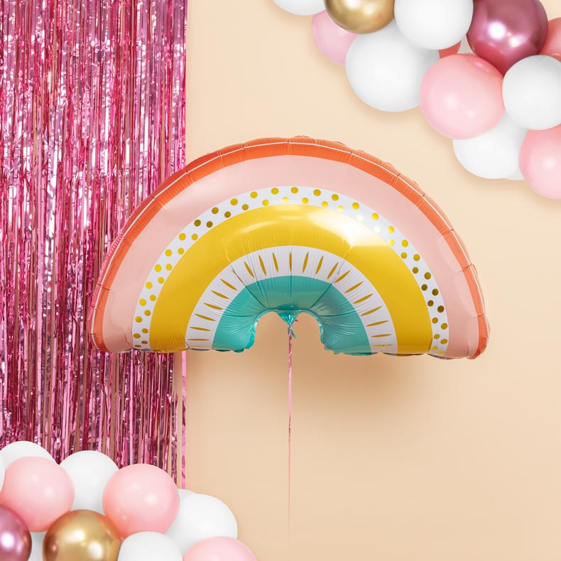 Balão foil em formato de arco-íris medindo 94 x 60 cm multicolorido. Muito fácil de pendurar e pode ser inflado com hélio ou ar.