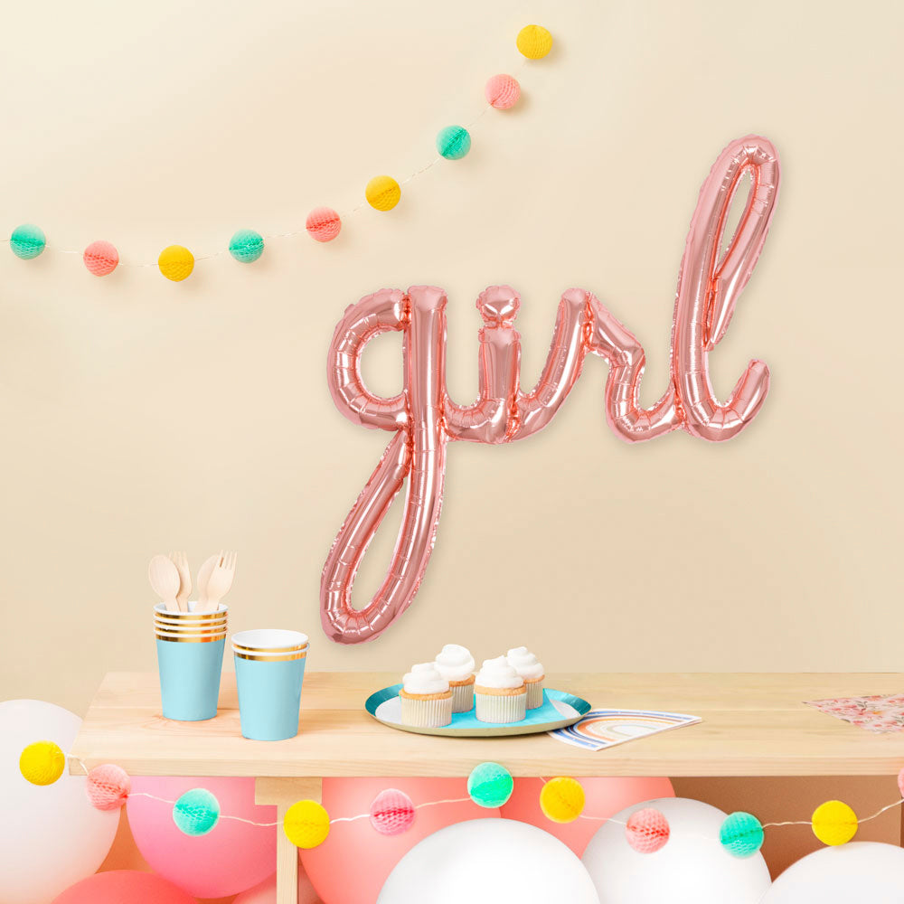 Balões de alumínio com letra caligráfica 'menina', 1 peça de 100 cm, ouro rosa, ideais para decorar os chás de bebê mais especiais. Combine com o resto dos elementos básicos para completar as suas festas!