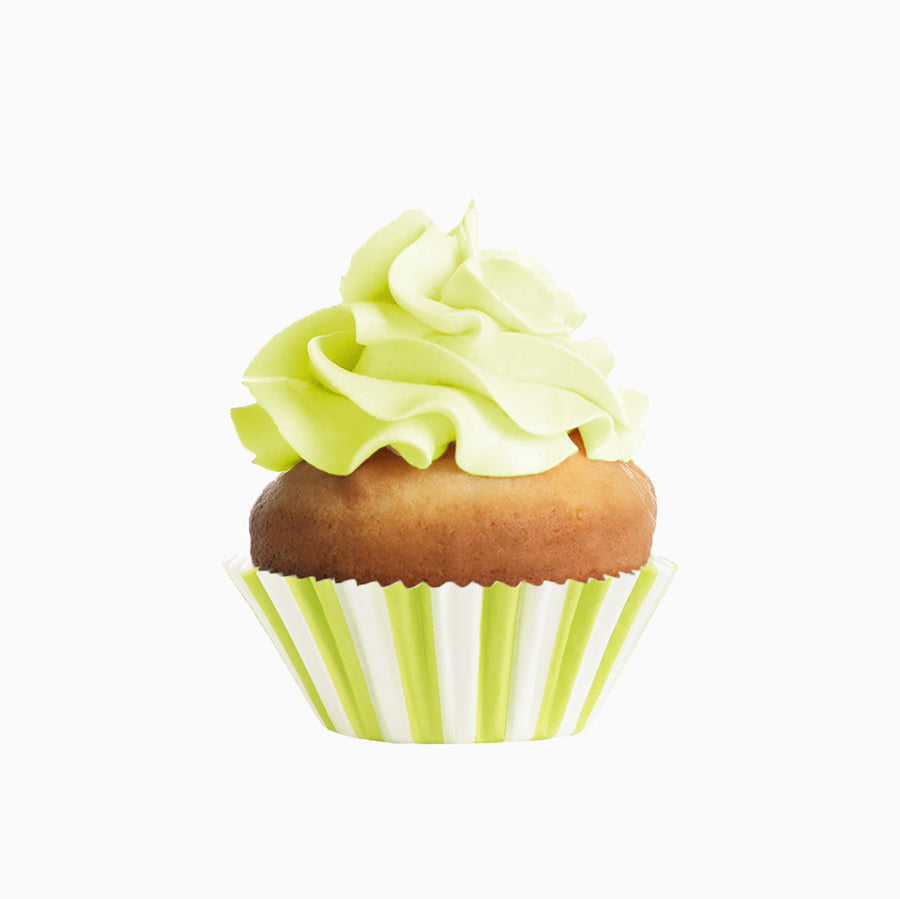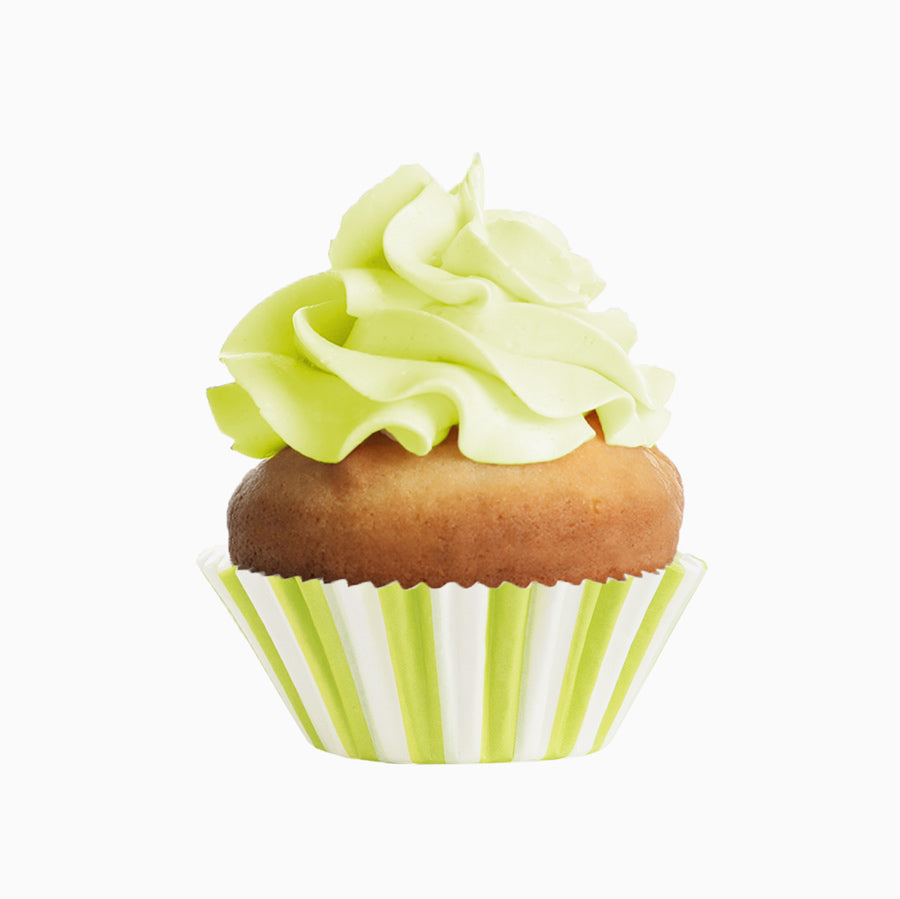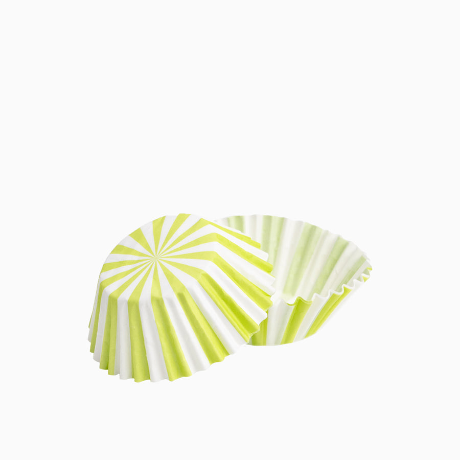 Pacote de 50 pequenos moldes redondos Ø 5,2 x 3 cm com desenho listrado em verde limão e branco. Ideal para assar, forno e microondas.