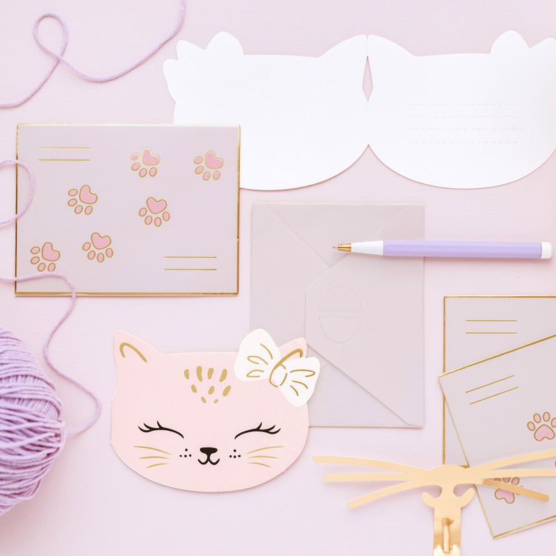 Decore o espaço com guirlandas de silhuetas de gatos e balões em formato de felino. Use toalhas de mesa e guardanapos com estampas de patas de gato e cores suaves como cinza e rosa 🌸.