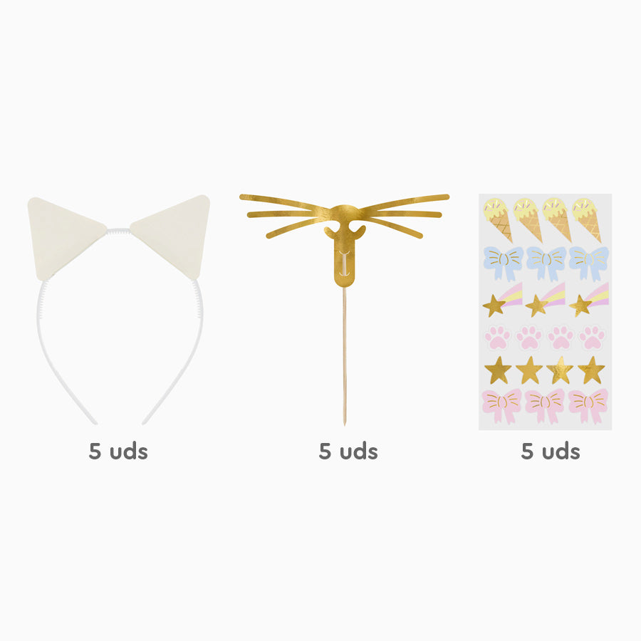 Conjunto de 5 tiaras com 5 adesivos e 5 bigodes.