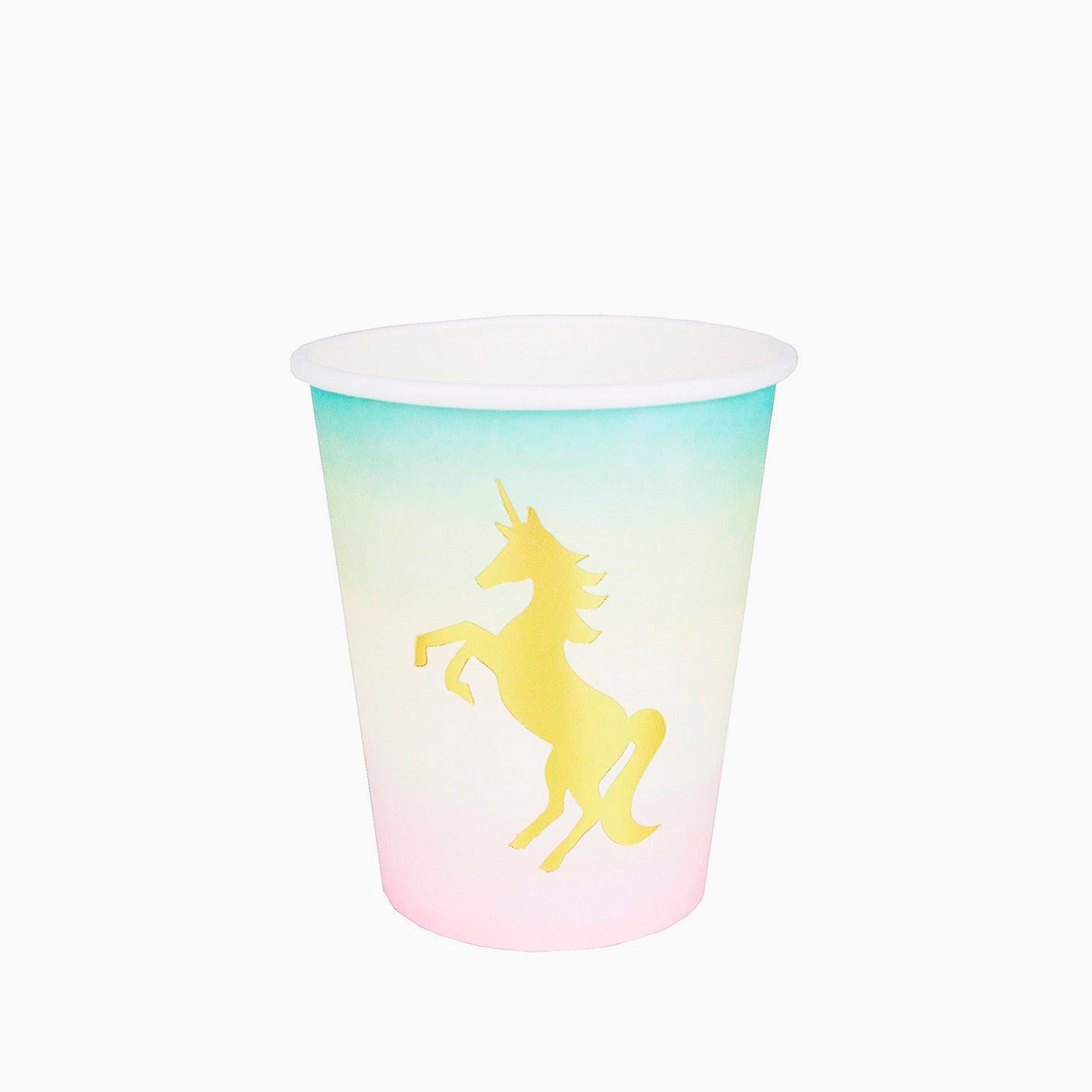 Pack de 12 copos de cartão em tons pastéis com desenho de unicórnio dourado para celebrar aniversários mágicos, chás de bebé ou festas temáticas. Combine com o resto dos elementos de unicórnio para completar suas festas!